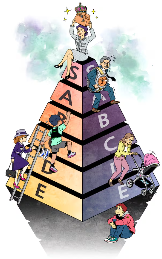 然而,“阶层图”正逐步覆盖到日常生活各个方面。从钱包、手表等日用品,到学历、收入、住房等人生指标,甚至连奶瓶、咖啡、炸鸡品牌也被纳入排序体系,部分榜单还在社交平台标注“老板级”“打工人级”等标签。
