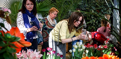 俄罗斯莫斯科,察里津诺国家博物馆保护区举办“察里津诺温室之春”花卉展,吸引民众参观。