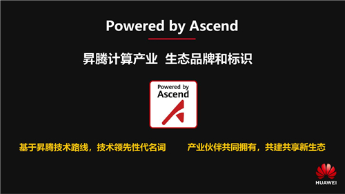 因聚而生,创新不止。昇腾计算产业是我们一个共同的产业。自从发布以来,也得到了大家的呵护和支持。今天我们也正式的发布昇腾产业的品牌和标识Powered by Ascend,这个标识和品牌是技术先进性和领先性的代名词,我们也希望在这个品牌的加持下,昇腾计算产业可以走得更高,走得更远。