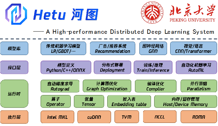 值得提出的是,实验室自主研发了河图(Hetu)深度学习引擎,解决超大模型训练时的自动并行问题,并具备通用、高效、敏捷、灵活和可扩展等特性。
