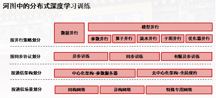 针对以上问题,河图进行了相应的优化设计。首先,河图支持所有主流通信架构、并行模式、同步协议以及常见优化方案,提供了更加丰富的功能,通用性更强;其次,河图支持半自动以及自动并行模式,硬件自适应感知最优分布式部署方案,部署更加便捷,提高了易用性;最后,河图支持统一分布式计算图中间表达,编译后适配多种通信算子,显著降低了系统架构的复杂性。