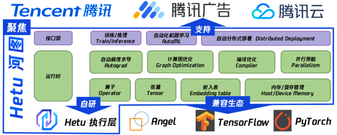除河图外,Angel4.0中也将实现与TensorFlow、PyTorch等业界主流框架,以及更多腾讯自研组件的生态兼容,极大降低使用复杂度,努力成为业务友好的、高效易用的工业级分布式深度学习框架。