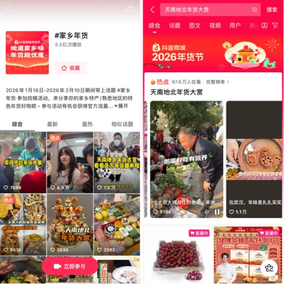 抖音商城年货节「家乡年货」专项活动,不仅在传统年味与现代消费方式之间架起了桥梁,也让更多地方特色年货被看到、搜到和买到。这个春节,来抖音商城,发现和选购全国地道年货,和亲朋好友共品年俗、共享年味!