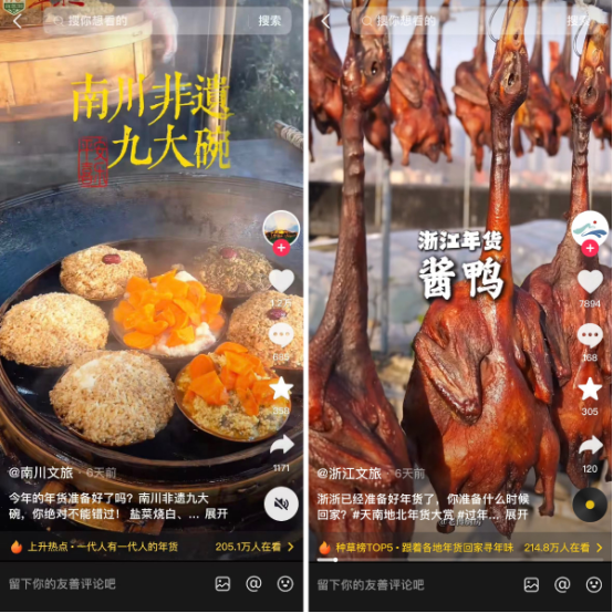 在#天南地北年货大赏 话题下,河南猪皮冻、潮汕卤鹅、南川非遗九大碗、浙江酱鸭轮番抢位……从家常手艺到地方特产,天南海北的用户化身家乡年味推荐官,接连晒出最具代表性的年货。