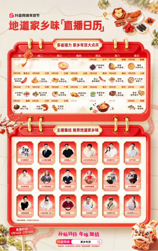 @与辉同行 、@小明正能量、@李晨nic等头部作者,将以专场直播的方式,为各地特色年货强势站台;@郑直等扎根本地的中腰部作者与商家,则以真实感受引发地域共鸣:他们在直播间生动讲解、现场试吃,让消费者透过屏幕感受地道家乡年味。