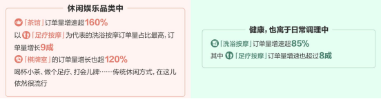 过去一年中,武汉的洗浴按摩订单量增长9成,杭州的洗浴按摩订单量增速超85%,其中足疗按摩订单量增速也超8成。
