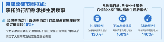 1小时交通圈的方便快捷,让石家庄满足商务出行及中转需求的住宿消费在平台快速增长,其中经济型与舒适型酒店订单量占比超45%。