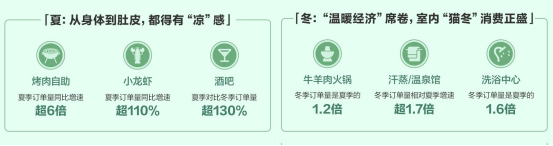 在冬季,济南的牛羊肉火锅、汗蒸温泉订单量分别是夏季的1.2、1.7倍;而夏季,济南的烤肉自助、小龙虾等具有“爽感”的品类增长迅猛,订单量同比分别增长超6倍、超110%。