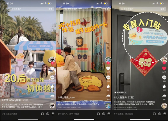 与此同时,抖音生活服务「冬日遛娃好去处」将IP势能延伸至更丰富的场景。例如,联合亲子酒店打造的限时亲子体验房,通过沉浸式的场景布置与情境化任务设计,将住宿转变为一场为期有限的主题冒险。这不仅回应了家庭对“住宿也要有趣”的期待,更以时间窗口营造稀缺感,有效激发宝妈的即时决策与预订意愿,显著提升了产品的附加值与差异化竞争力。