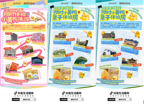 为进一步放大IP的情感势能,抖音生活服务「冬日遛娃好去处」基于小黄鸭20周年这一情感节点,联合亲子酒店、洗浴中心等商家推出系列纪念套餐,并设置轻量互动任务:孩子与父母在体验后带指定话题发布打卡视频,即可至商家前台兑换限定周边礼品。这种套餐体验+打卡领礼的简单组合,有效降低了家庭参与门槛,在增添仪式感的同时,也带动了线下体验的社交分享与二次传播。