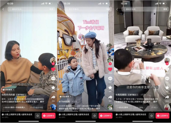 在这一生态中,热点话题成为引爆内容创作与用户参与的核心引擎。「冬日遛娃好去处」精准策划并推出一系列直击亲子互动趣点的内容标签,成功激发了达人及普通用户的共创热情。例如,购物场景下的#小孩上岗新年主理人能有多会买 ,通过展现萌娃主导家庭消费决策的趣味过程,迅速积累超32万播放量,生动传递了亲子购物的情感价值与决策新趋势。在酒店场景,话题#沉浸式感受人类幼崽酒店测评 以孩子们天真烂漫的第一视角“测评”住宿体验,相关视频播放量突破34万,为酒店商家提供了极具说服力的口碑背书与场景化展示。