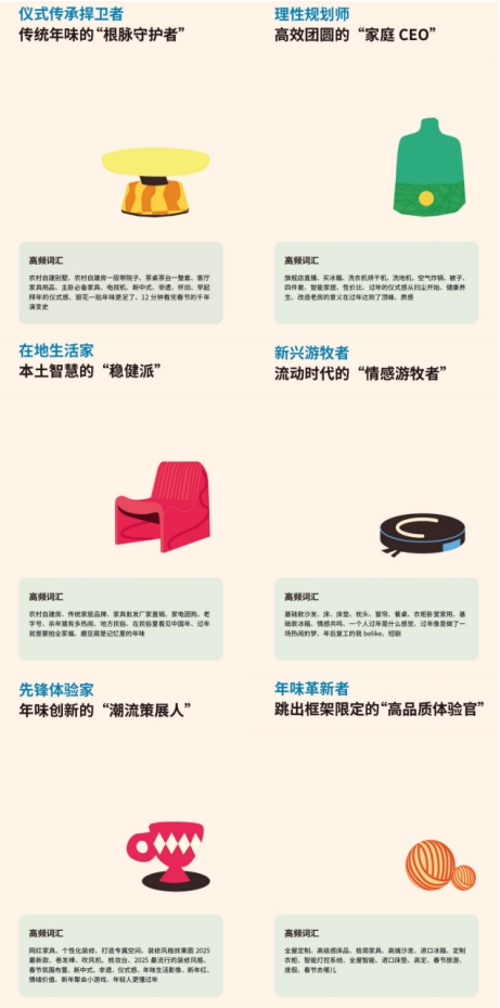 这六类核心人群各有底色、相得益彰:仪式传承捍卫者坚守传统年俗、传承地域文化,是年味根脉的守护者;理性规划师统筹家庭资源、优选好物服务,追求高效团圆;在地生活家笃信本土习俗、扎根市井烟火,筑牢新春烟火气;新兴游牧者依托云端工具、维系跨城情感,让团圆突破地域限制;先锋体验家热衷新潮玩法、重视个性表达,打造“赛博年味”;高价值人群聚焦品质生活,从家庭健康、高端审美到高效质感,多元维度推动年味不断进阶。