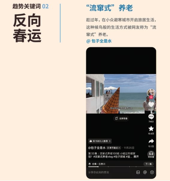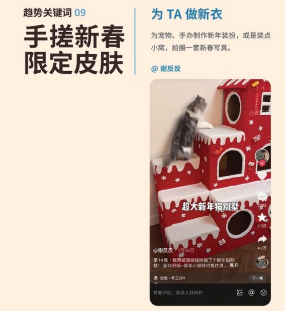 同时,家庭结构的变化让“毛孩子”成为团圆的一份子,携宠返乡、宠物专业护理等消费需求持续提升,智能设备让留守宠物的照料更安心,团圆的温暖,从未落下任何一个家庭成员。2025年春节期间,抖音达人@小帅家的大狼狗们 分享了带宠返乡的真实情况:好消息是此次带狗狗们过年返乡,乘坐的是房车,为出行提供了一定的便利;坏消息则是同行的狗狗数量较多,出现了超载的情况。视频以略带抽象又不失趣味的表达,道出了新年里养宠家庭带着毛孩子奔赴团圆、享受温馨时光的真实写照。
