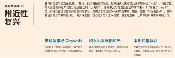 而“附近性年味”的兴起,让人们重新发现身边的文化美好,新春Citywalk、老街老字号重访、社区民俗市集参与,让人们放弃远方奔波,在身边的烟火气中创造新年记忆,让团圆回归人与人的真实联结。