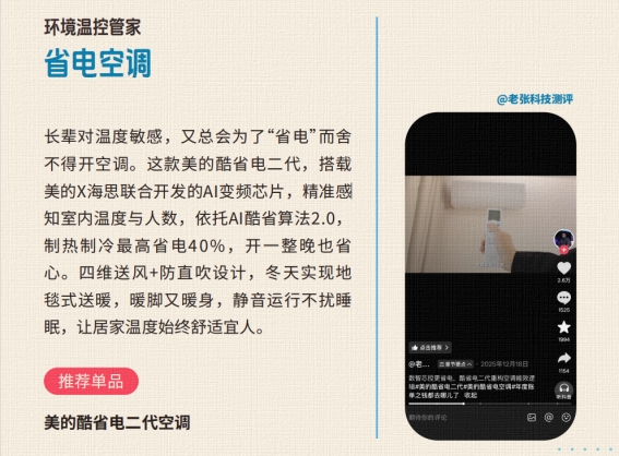 亲情焕新的核心,是让关心不再流于形式,让陪伴不再受限于距离:长辈对温度敏感却总惦记省电,美的酷省电二代空调成为居家温控的贴心之选。依托美的AI酷省电算法2.0,制热制冷最高省电40%,开一整晚也无需担心能耗;四维送风搭配防直吹设计,冬天能实现地毯式送暖,暖脚又暖身,用科技守护长辈的冬日暖意。