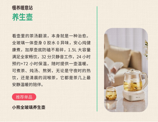 新春的温暖,藏在一杯热饮的治愈里,小熊电器全玻璃养生壶等产品,融入“年味养生计划”,全玻璃健康煮、多档功能易操作,满足家庭轻松养生需求,助力春节身心修复与慢节奏生活;