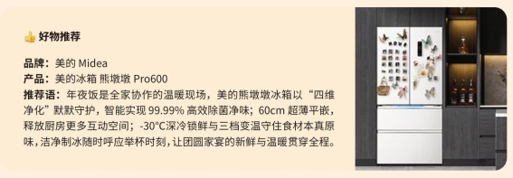 在年夜饭协作与家庭养生的场景中,美的熊墩墩Pro600冰箱等家电,支持“全家协作年夜饭”场景,以超薄平嵌、除菌净味、深冷锁鲜等功能,守护团圆家宴的新鲜与温暖。这些品牌好物,精准对接新春生活的核心需求,与年味场景深度绑定,成为“认真爱、用心生活”的重要载体。