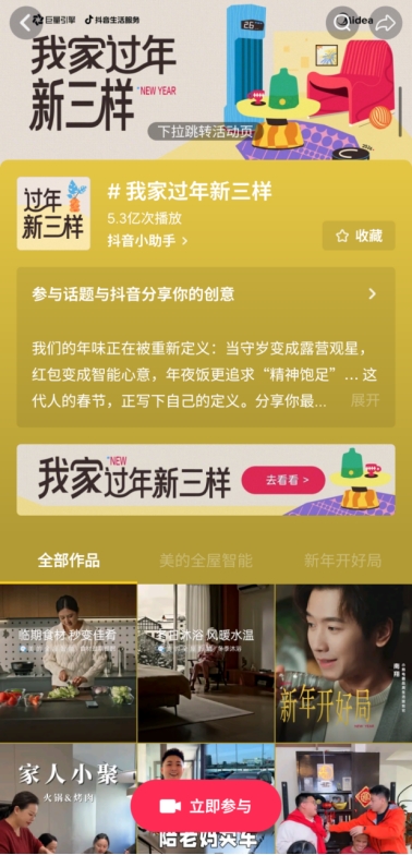 此外,美的与抖音生活服务家行业联合推出的#我家过年新三样 专属话题,更是深挖新时代年味的全新内涵,截至2026年2月2日,话题收获超5.3亿次播放,无数用户分享属于自己的新年味表达:美的全屋智能把“守护”藏进家里每一个角落,智能调节温湿度的空调让室温始终保持舒适,全家齐聚守夜的夜晚温馨愉快;智能冰箱语音开启一键备餐模式,搭配美的美居APP,根据食材智能推荐食谱,让年夜饭筹备更加得心应手;自动恒温的热水器让洗澡不再需要心理建设,享受身心畅快的除夕之夜。各色好物让守岁、红包、年夜饭的传统形式,在当代有了全新的演绎,也让品牌与用户在新春话题中形成深度共鸣,共同记录年味的变迁。