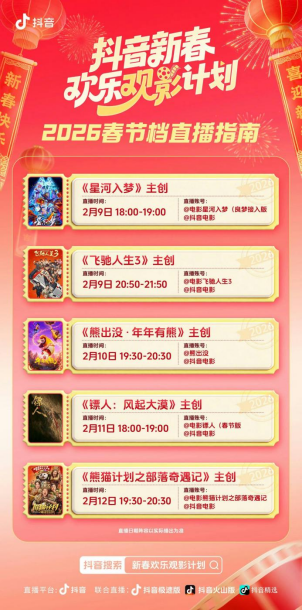 2月9日—2月12日,@抖音电影 和各影片官方抖音账号将进行共创直播,《星河入梦》《飞驰人生3》《熊出没·年年有熊》《镖人:风起大漠》《熊猫计划之部落奇遇记》等多部热门影片的主创将轮番空降,与守候多时的影迷在线“贴贴”。那些尚未公开的幕后趣事、隐藏的剧情彩蛋、还有独家定制的新春祝福……通通一次性放送!