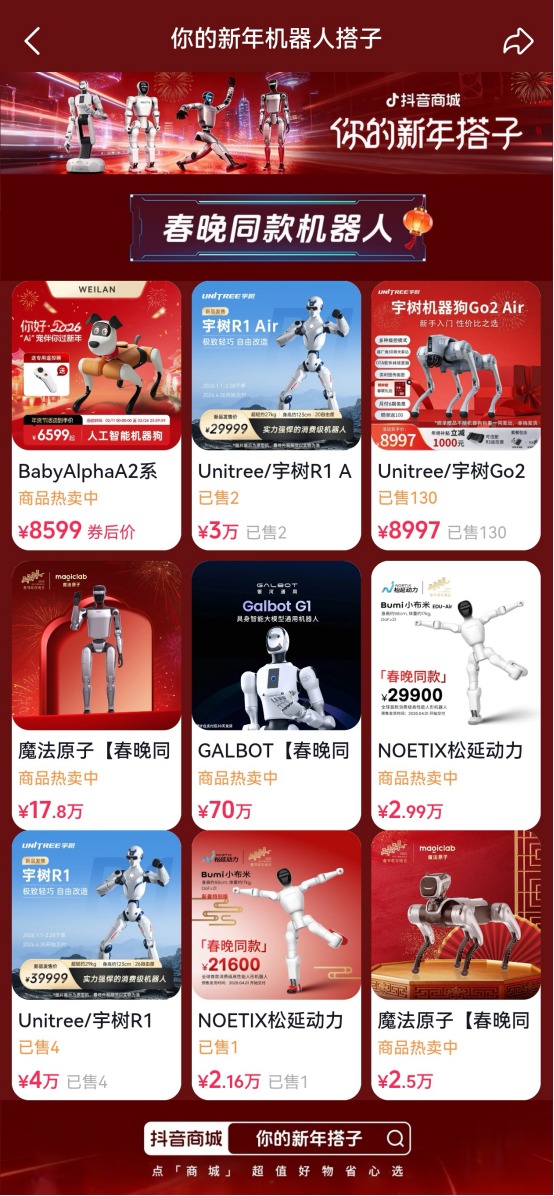 从“看春晚”到“买同款”,既是中国机器人走向规模化应用的产业缩影,也折射出科技消费品加速融入大众日常生活的消费趋势。《2026全球具身智能产业投资报告》预计,今年人形机器人头部厂商将实现万台级交付,消费级足式机器人销量将突破10万台。2026年,抖音电商将携手更多机器人品牌,让前沿科技借助平台力量走进千家万户,为美好生活增添触手可及的智造温度。