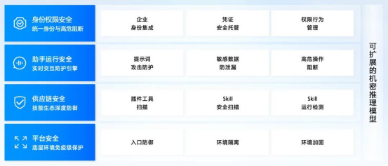 针对 Agent 行为的动态性,AI 助手安全解决方案构建了“事前预防、事中拦截、事后审计”的纵深防御体系。