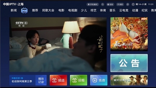 升级更新后的“看电视”交互主页中,直播频道框在显著位置呈现,并默认播放CCTV-1直播频道。免费专区、频道回看功能优化展示,免费节目多,收费内容少,是新首页最显著的特点。
