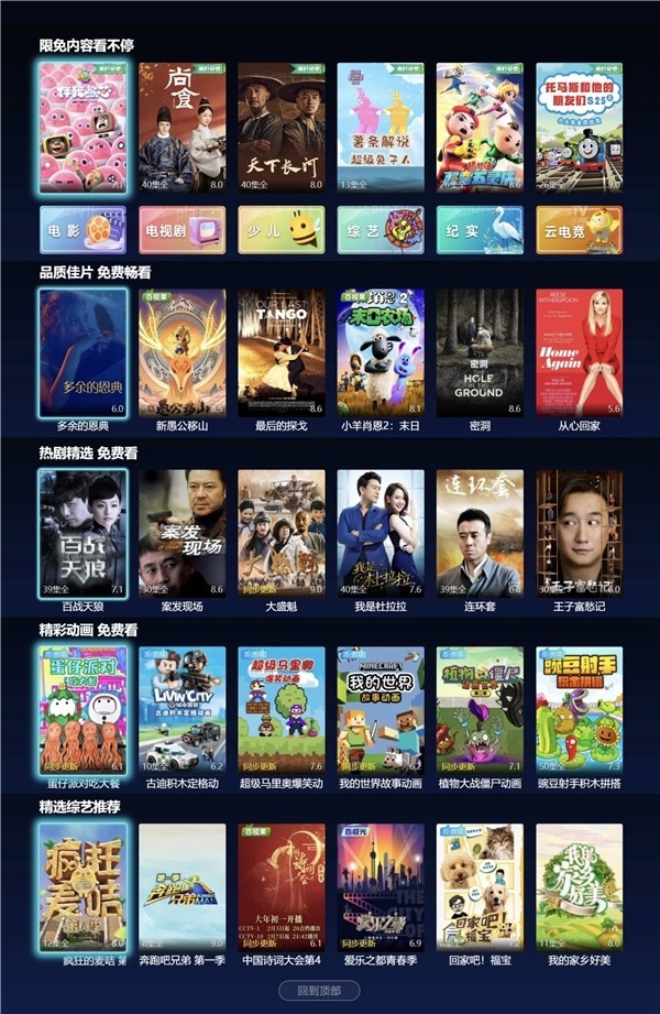 升级后的免费专区节目量达10万小时,专区首行显著位置不断更新推荐当周精彩限免内容。用户可通过分类入口进入各类别筛选查找喜爱的免费节目,百视通自主研发的智能推荐系统则足够“善解人意”,将根据用户收视喜好来展示推荐相关内容,真正做到看你想看。
