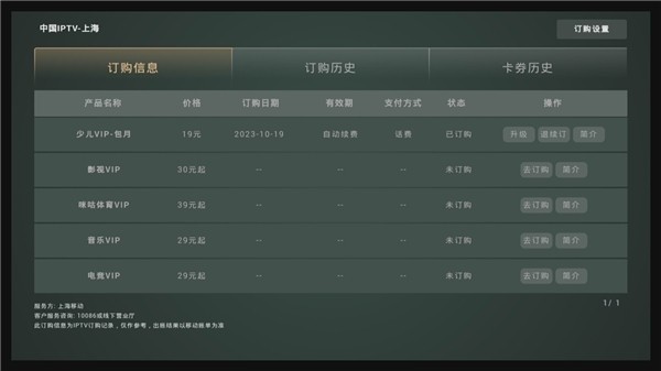 与免费内容“显而易见”相比,付费则需要多次操作才能完成。在支付页,用户可清晰地查看增值产品收费价格、详细的订购说明和服务协议,用户可点击“确认”键进行账单支付,也可以扫描右侧二维码进行手机扫码支付。用户若选择账单支付方式订购连续包月产品时需要进行二次确认。顶部菜单中提供“应用中心”和“我的”快捷入口,规范各类电视应用安装和用户订购信息管理,防止“吃闷亏”和“误操作”。
