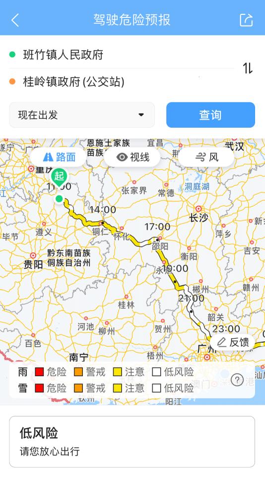 对于选择自驾返乡的朋友们来说,雨雪天气也要绷紧安全弦。在雨雪天气中行车,路面湿滑是最大的安全隐患。因此,建议大家在出发前检查车况,确保轮胎、刹车等关键部件的工作正常。墨迹天气驾驶危险预报,可根据起点和终点实时监测气象数据分析路面、视线、风力等情况,提示大家合理调整路线。