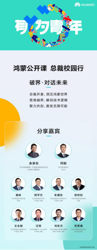 智能化时代,科技创新怎样才能更匹配现代智能生活需求?正在全国多所高校陆续展开的鸿蒙公开课·总裁校园行活动,邀请包括华为常务董事长、产品投资委员会主任、终端BG董事长余承东,华为终端BG CEO何刚等在内的华为各领域总裁,现场分享鸿蒙的场景体验和各项创新技术,结构鸿蒙生态魅力的同时,帮助当代大学生更好理解智能技术创新需求,洞察前沿科技未来趋势。