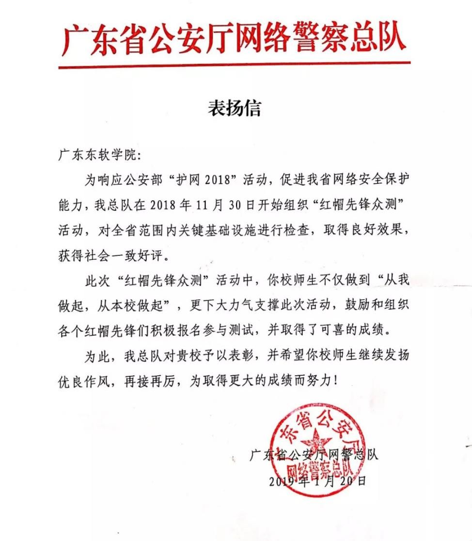 据了解,为响应公安部“护网2018”活动,促进我省网络安全保护能力,广东省公安厅网警总队在2018年11月开始组织“红帽先锋众测”活动,授权省计算机网络安全协会人才与教育专委会对我省范围内关键基础设施进行了检查,北京永信至诚科技股份有限公司为本次项目活动提供运营支持和技术支持。广东东软学院作为广东省“红帽先锋”的主力单位,主要参与了这次众测的具体业务。