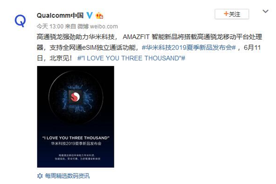 在智能穿戴领域中,华米科技有着非常庞大的用户群体,今天上午,华米科技已经正式宣布将在6月11日举行新品发布会,而现时有关新品的信息也逐渐被网友爆出。今天下午,高通已经正式宣布与华米科技达成合作,AMAZFIT智能手表新品将搭载骁龙移动平台处理器,全面支持eSIM独立通话功能。