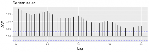 如果数据有趋势性,那么对于较小的延迟,自相关性趋向于比较大并且为正。当延迟增大时,ACF会慢慢变小。