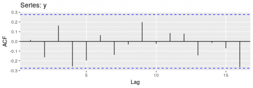 我们期望所有的ACF值接近于0,但因为一些随机变化,他们不可能正好等于0。对于白噪声,我们期望95%的ACF突刺都在之间,T是时间序列的长度。通常我们会画出这些范围,图上用蓝线表示。如果超过5%的突刺超出了这个范围,这个时间序列就可能不是白噪声。