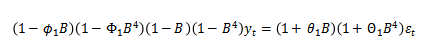 模型的周期性部分和非周期性部分很相似,但包括了周期后移。比如,ARIMA(1,1,1)(1,1,1)4对于季度数据(m=4)可以写成: