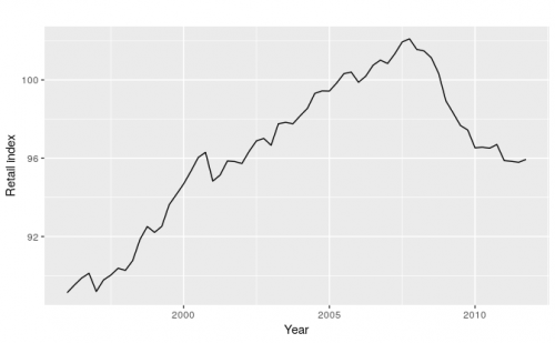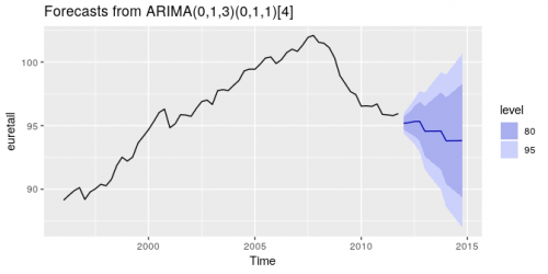 这个例子是欧洲零售指数从1996到2011年的数据,我们把它套进SARIMA模型进行预测。