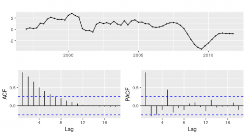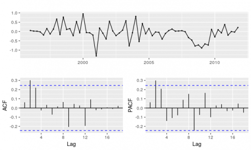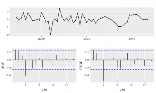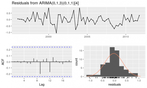 ACF和PACF都在延迟2有明显突刺,延迟3的突刺也不小,所以模型应该还有额外的非周期性部分。SARIMA(0,1,2)(0,1,1)4模型的AICc是74.36,SARIMA(0,1,3)(0,1,1)4模型的AICc是68.53。其他的AR参数都没有更小的AICc值。所以,我们选择SARIMA(0,1,3)(0,1,1)4,画出该模型的残差: