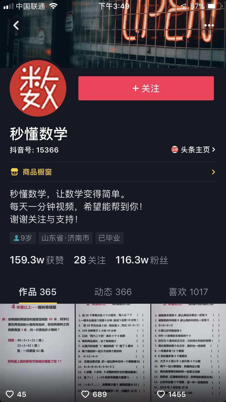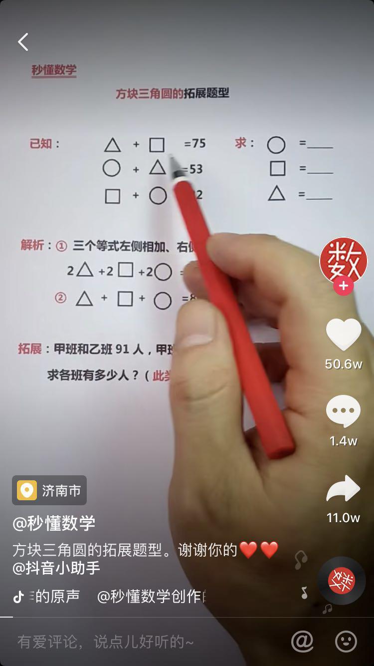 名为“秒懂数学”的“神仙老师”,通常是“只闻其声,不见其人”,一道数学题,一根写字笔,是他的全部装备。他在提炼经典题型的同时,也按难易程度进行年级区分,帮家长与孩子精准定位所需学习的部分。到目前为止,“秒懂数学”账号已经发布了365个相关作品,获得了116.3W家长与孩子的认同。