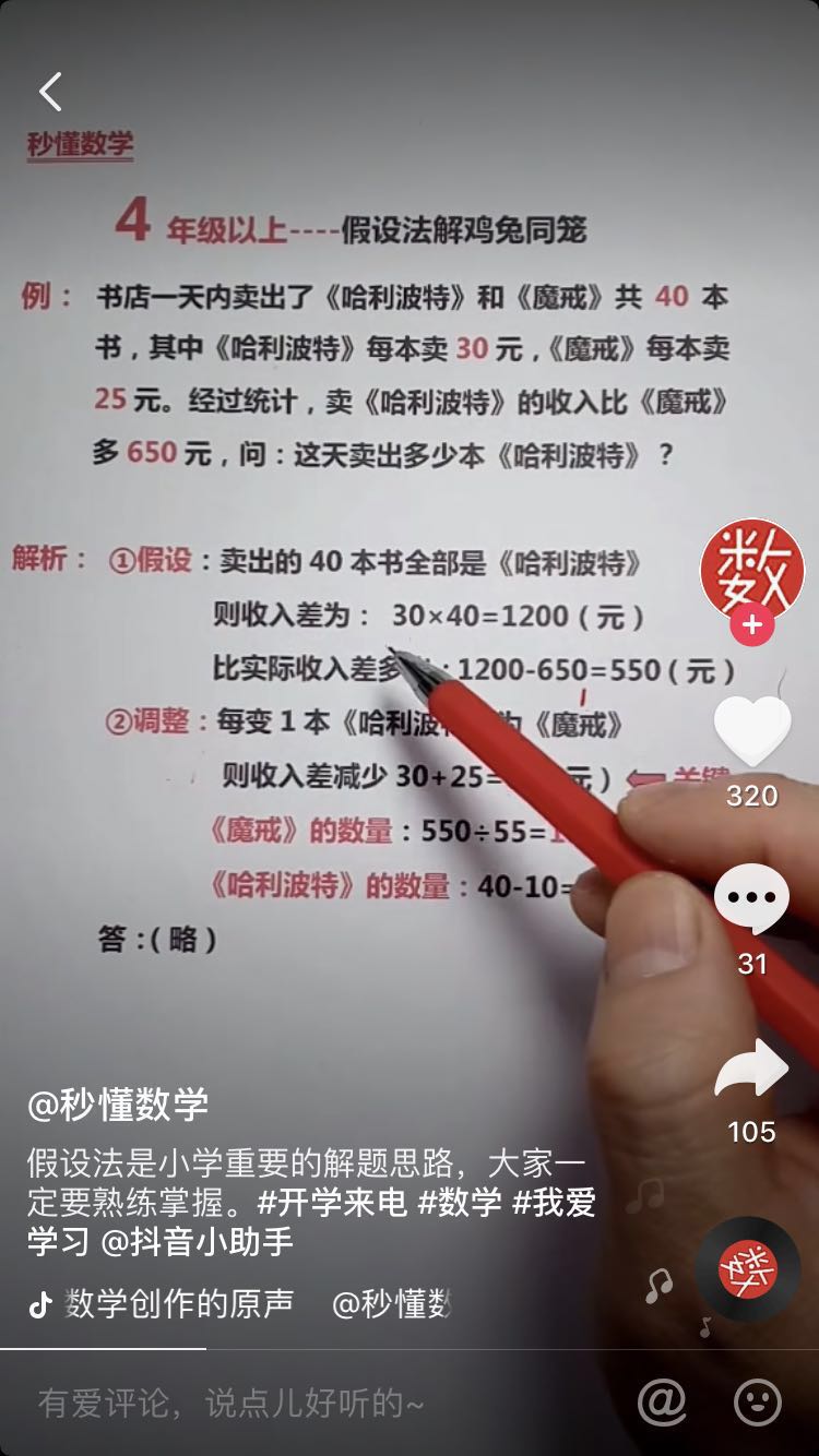 抖音“秒懂数学”致力于让数学知识变得更为简单有趣,他系统研究小学生数学课程特点,深入了解各种题型,同时洞察小学生学习特点机大脑发展特点,将抽象化的数学思维具体化,以小学生更能接受的讲述方法讲述每一种题型。