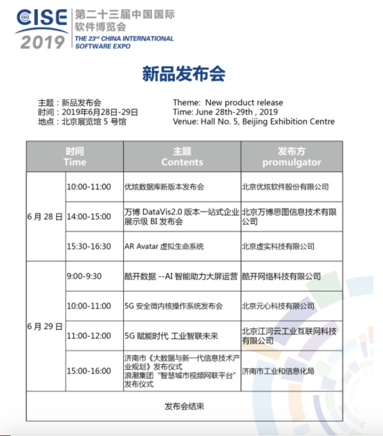值得关注的还有两天内将在北京展览馆5号馆陆续展出的优秀新品。28号将举办北京优炫软件股份有限公司的“优炫数据库新版本发布会”、北京万博思图信息技术有限公司的“万博DATAVIS2.0版本一站式企业展示级BI发布会”等。29号主要关于5G技术,将开展北京江河云工业互联网科技有限公司的“5G赋能时代 工业智联未来”与北京元心科技有限公司的“5G安全微内核操作系统发布会”。
