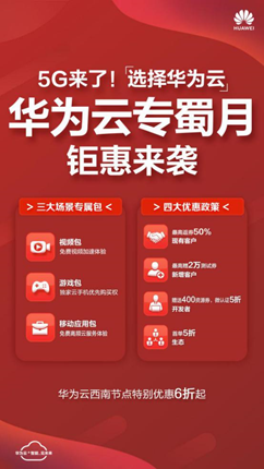 7月2日,华为云宣布正式启动“华为云专蜀月“优惠活动,依托华为云在云服务、5G、AI等领域的优势,助力西南地区互联网企业打造5G时代新势能。