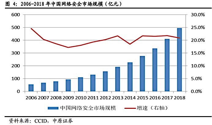据赛迪数据统计,2018年全球网络安全市场规模1269.8亿美元,增速8.5%,而2018年中国网络安全市场规模495.2亿元,增速20.9%。从数据可以看出,中国网络安全市场规模增速远高于全球水平,若按照全球平均水平来测算,我国网络安全市场还有近一倍的增长空间,对应千亿市场规模。