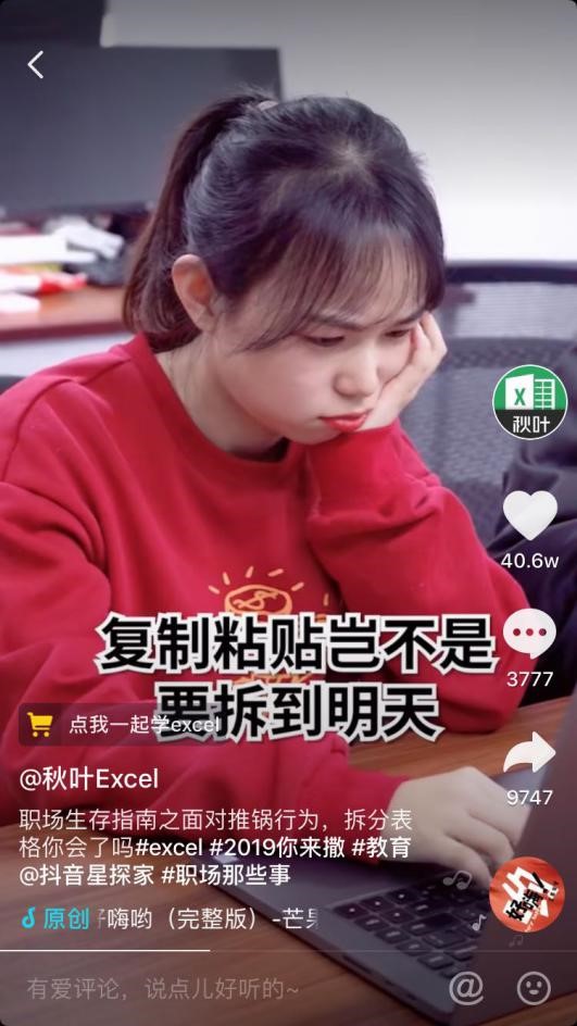 如其首页置顶的一条短视频,老板丢来一份没有拆分的excel表格,让女同事头疼不已,这时男同事利用excel快捷方式顺利帮女同事快速进行了表格拆分。他们幽默风趣的表演形式,让网友们在不经意间就get到如何进行表格的拆分。