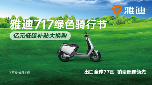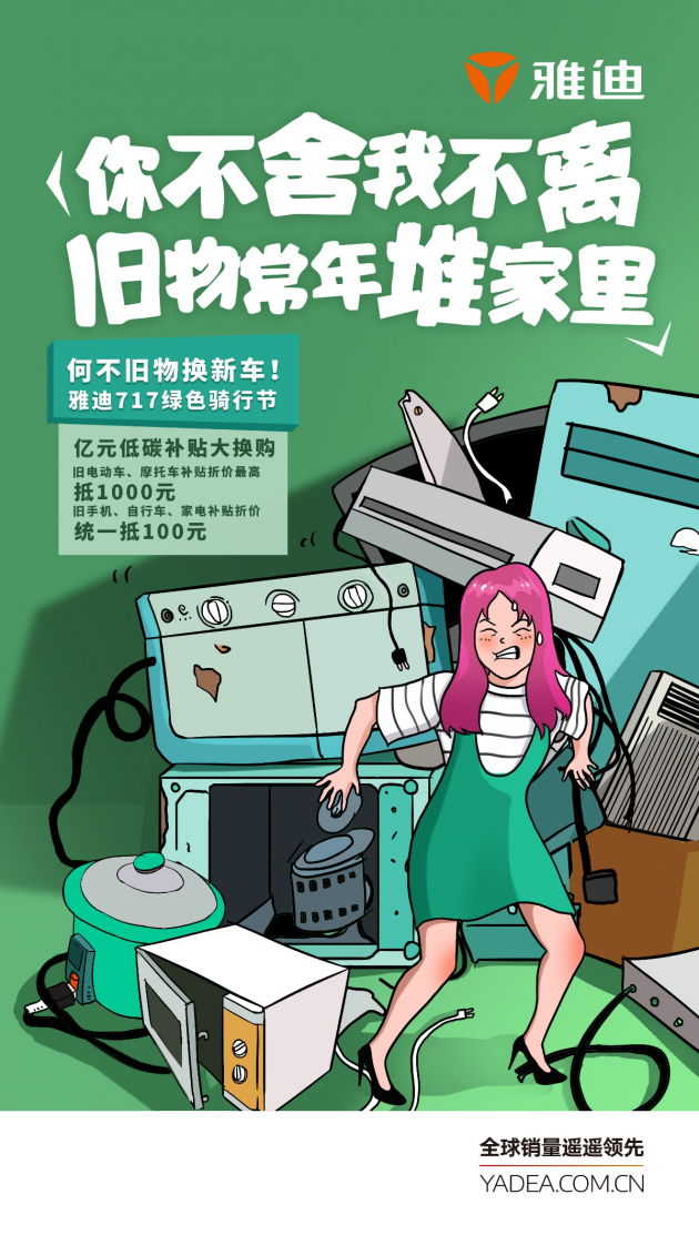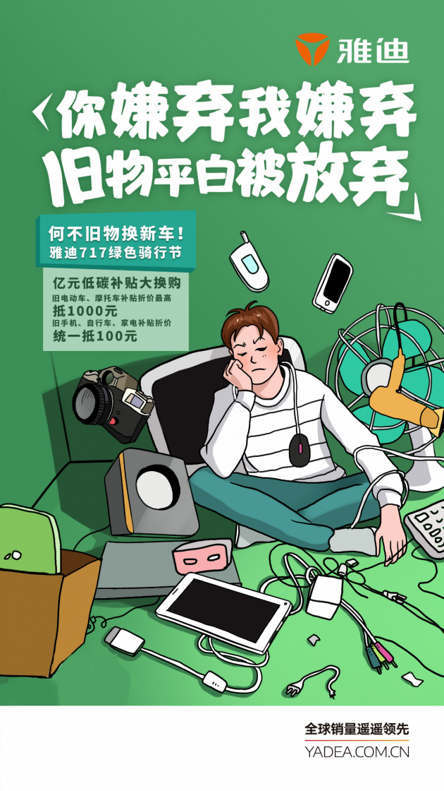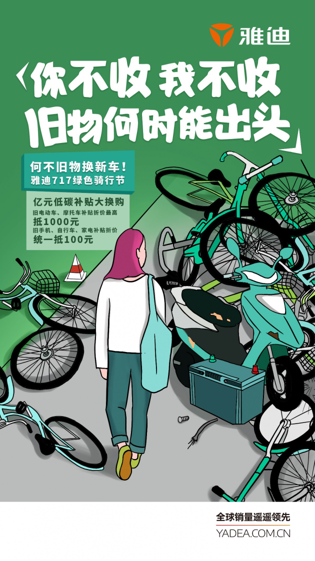 第三届雅迪717绿色骑行节推出了“亿元低碳补贴大换购”,用旧物换新车!