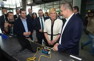克罗地亚总统科琳达·格拉巴尔-基塔罗维奇在体验mBot机器人