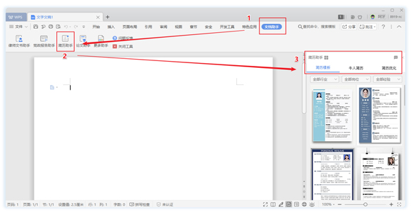 使用WPS Office客户端,新建文档,选择选项卡中的【文档助手】页面,点击「简历助手」,便会界面右侧弹出简历助手的工具窗口。