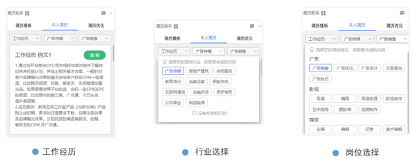 而当不知道如何主观论述「在校经历、工作经历、自我总结、项目经历」等模块时,可以点击右侧工具窗口的【牛人简历】,选择需要的模块、行业以及岗位,即可浏览并参考各行业职场大咖的简历论述,让你从中获取灵感,并且获得正确的指导,写出更让HR认可的简历措辞。