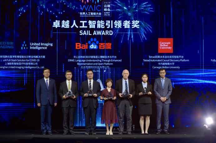 7月9日,2020世界人工智能大会(WAIC)正式开幕,大会颁布最高奖项SAIL奖(Super AI Leader,卓越人工智能引领者),百度文心(ERNIE)知识增强语义理解技术与平台获奖,百度技术委员会主席吴华上台领奖。