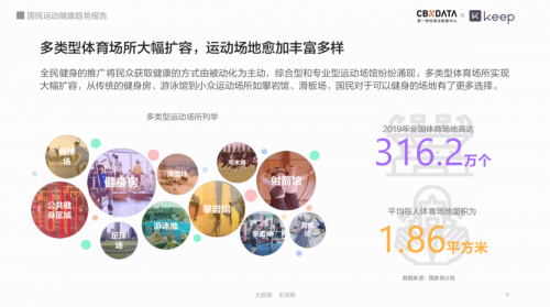 全民运动健身的推广,使得健身馆、游泳馆、攀岩场等运动场和体育馆蜂拥出现,为全民运动提供了场地支持。《报告》显示,2019年,全国体育场地高达316.2万个。