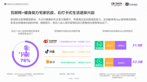 疫情期间,“宅家运动”引发热议,借助线上直播、视频课程等数字化运动手段,突破运动场景的时空限制,使得“宅家”群体可以通过运动app实现在特殊时期坚持运动。《报告》发现,疫情期间,运动健身app的月活规模是去年同期的1.9倍,使用时长为去年同期的2.5倍。